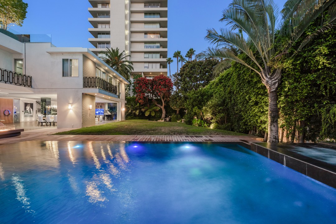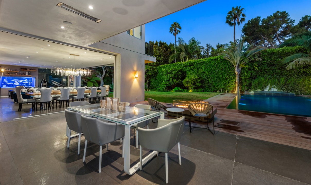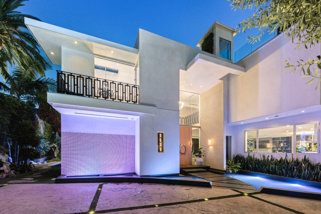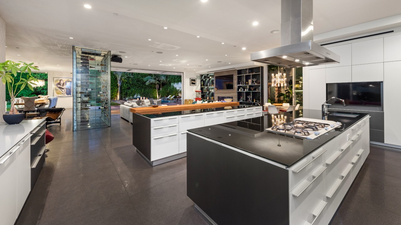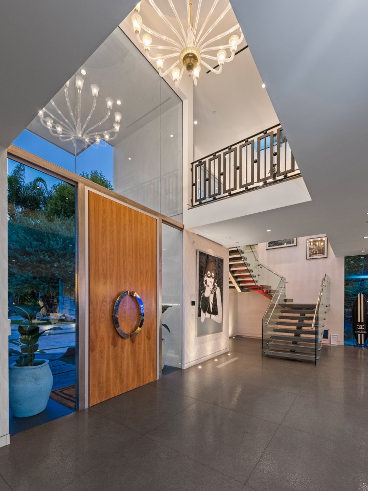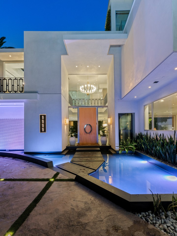 Paradise awaits you in the ultimate expression of opulent living inside this modern masterpiece. Across the welcoming dual entry motor court with its central olive tree and glass doored showcase garages is your entry to expansive living spaces. A grand bar to the left with saltwater aquarium, sitting room in front of you, formal dining and floor to ceiling glass wine refrigerator to your right are wrapped in glass and Fleetwood pocket doors which connect you seamlessly to natural light.