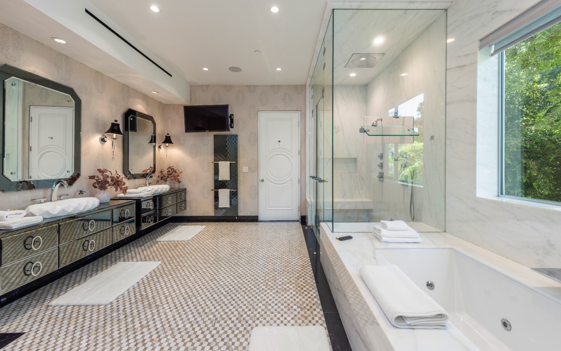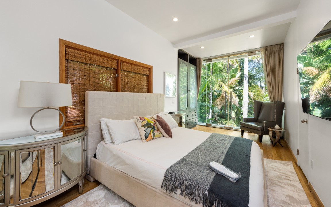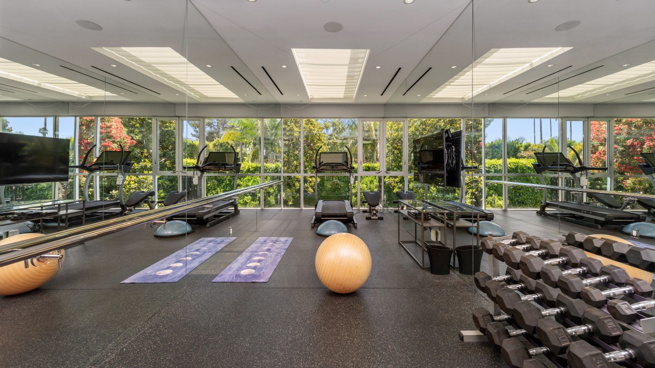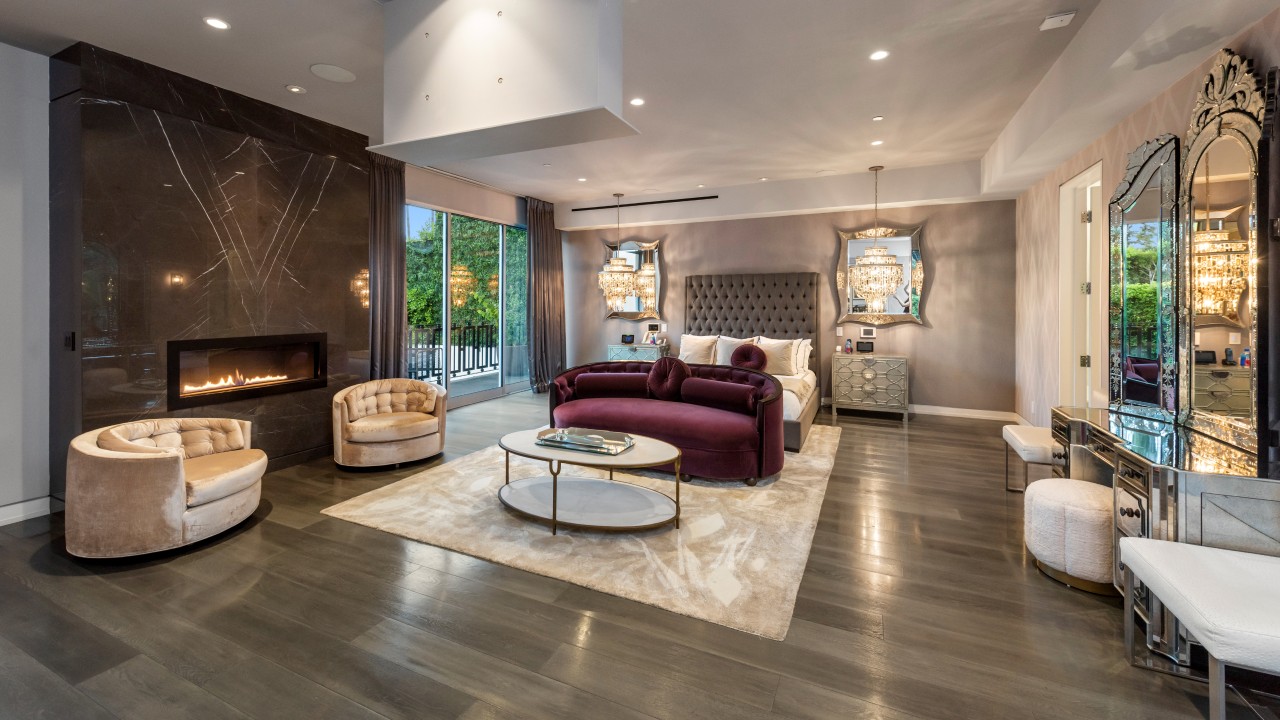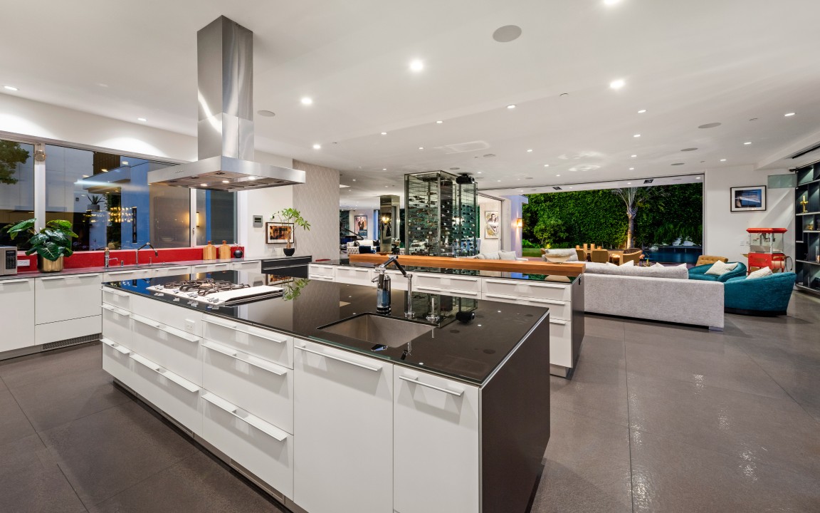 Paradise awaits you in the ultimate expression of opulent living inside this modern masterpiece. Across the welcoming dual entry motor court with its central olive tree and glass doored showcase garages is your entry to expansive living spaces. A grand bar to the left with saltwater aquarium, sitting room in front of you, formal dining and floor to ceiling glass wine refrigerator to your right are wrapped in glass and Fleetwood pocket doors which connect you seamlessly to natural light.